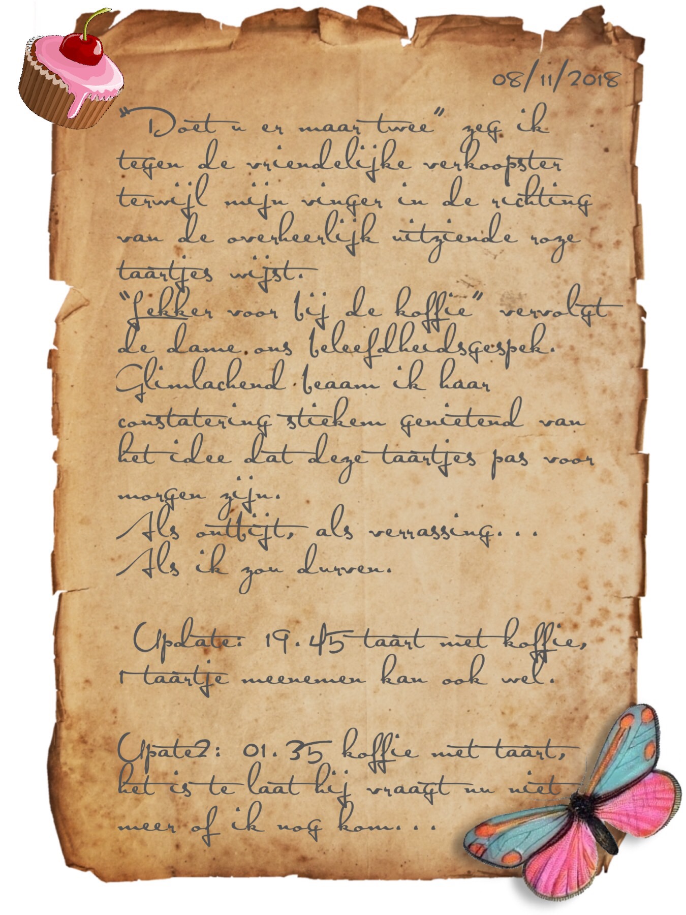 Terwijl ik nog wat verder mijmer doemt in de verte een parkeerplaats en tegelijkertijd de werkelijkheid op… Als ik de sleutel terug draai vraag ik me af wat me bezielde op het moment dat ik zijn uitnodiging, om de tuin te komen bekijken, accepteerde. Nerveus vis ik mijn telefoon uit m’n tas om een berichtje te sturen dat ik er ben. Ongetwijfeld duurde het niet meer dan een minuut maar na vier keer mijn haar opbinden en mijn lipstick controleren en honderd keer tegen mezelf zeggen ‘je kunt het!’ staat hij opeens voor mijn auto. Heel even twijfel ik of het zonlicht, wat zich door de boomkruinen wringt hem nou mooier maakt of dat het andersom is… Ik houd het op het laatste, pak snel de meegebrachte koffie en cake en begroet hem. Natuurlijk zonder hem te kussen want dat soort dingen doen wij niet.